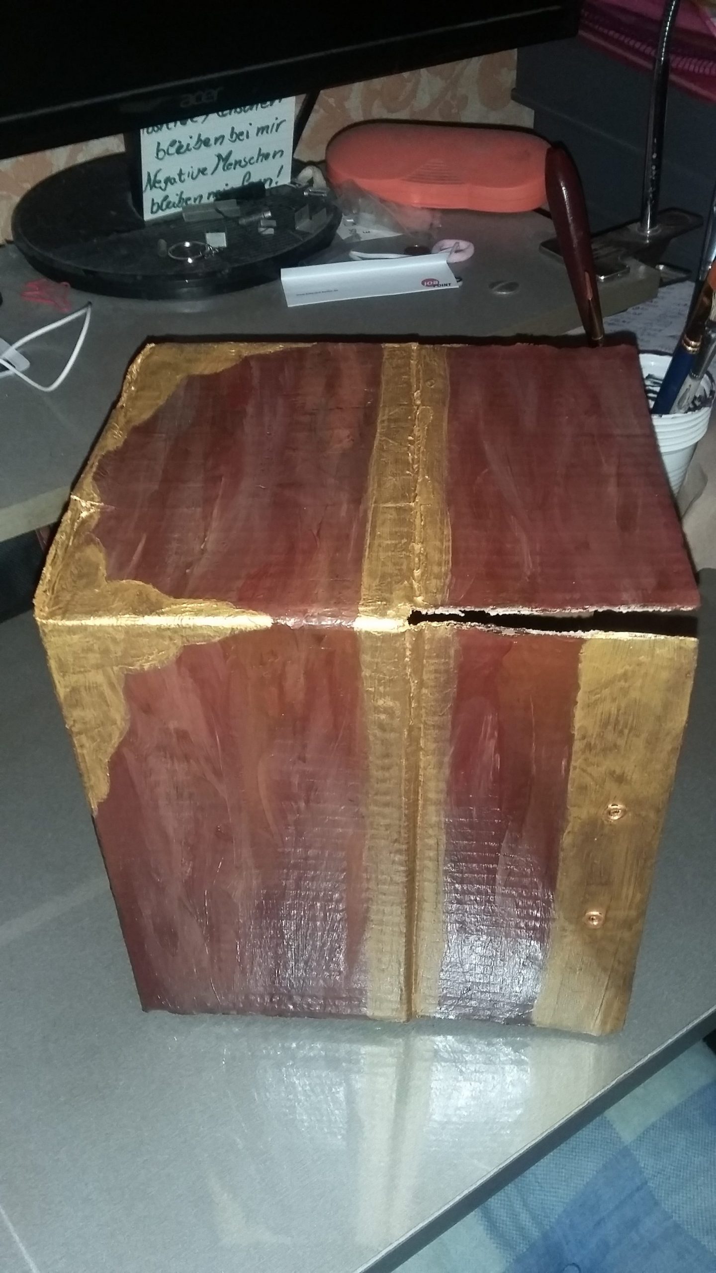 hast du ein paar Kartons und etwas Acrylfarbe? Super das reicht schon für eine tolle Schatzkiste. Wenn du noch bunte Glassteine, Pailletten,oder Aufkleber hast umso besser.